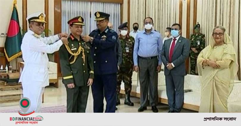 প্রধানমন্ত্রী শেখ হাসিনার উপস্থিতিতে জেনারেল র্যাংক ব্যাজ পরানো হলো নবনিযুক্ত সেনাপ্রধানকে